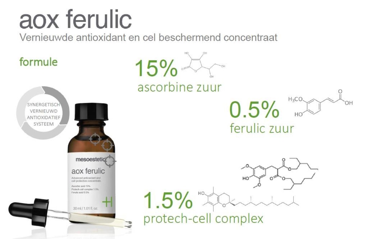 Mesoestetic AOX Ferulic een geavanceerd antioxidanten serum met een celbeschermende werking. De huid krijgt een mooiere uitstraling. De effectiviteit is bewezen dankzij de vele in vitro en in vivo testen. Dit zijn testen in het laboratorium met buisjes en op levende mensen.